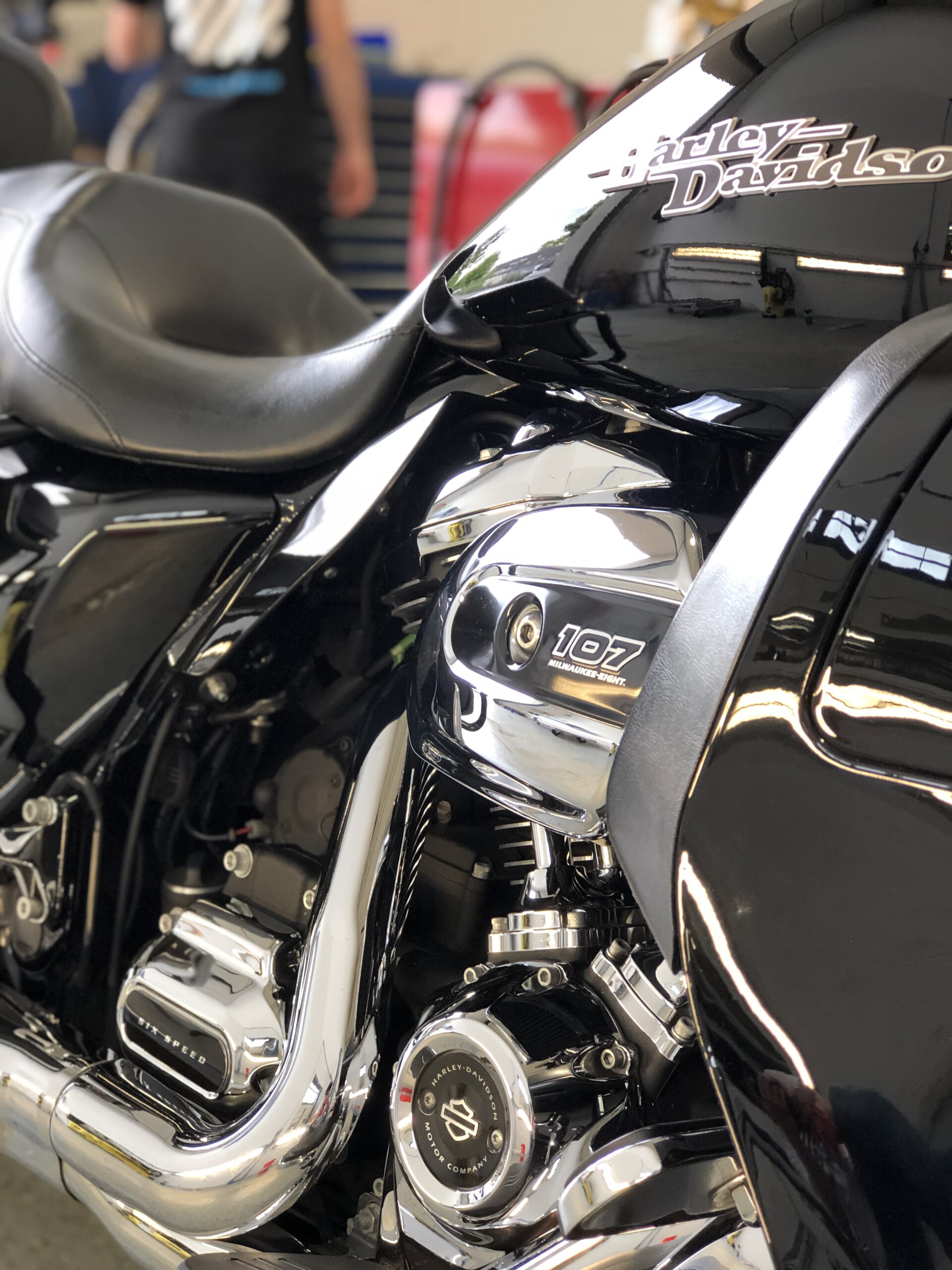 Wir haben diese Harley-Davidson gründlich gereinigt, versiegelt und poliert, um ihr ursprüngliches Glanzniveau wiederherzustellen. Die Herausforderungen bei der Aufbereitung eines Motorrads im Vergleich zu einem Auto sind zahlreich. Motorräder haben eine Vielzahl von Oberflächen und Komponenten, die schwer zu erreichen sind, insbesondere im Bereich des Motors, des Getriebes und der Auspuffanlage. Die vielen Ecken und Winkel machen es schwieriger, Schmutz und Verunreinigungen zu entfernen.